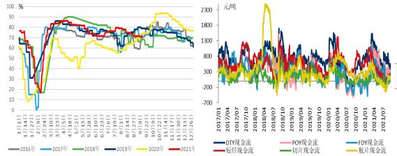 今年海运费高企及集装箱短缺问题突出,在上半年需求乐观预期下,国内外订单需求均部分提前透支。6-7月份,终端部分订单提前下达,江浙织机负荷逆季节性回升,导致三季度旺季需求部分前置。原料价格维持强势,而终端订单后续跟进乏力,织造工厂综合库存超去年高位,基本消化前期备货为主。8月中上旬,江浙织机负荷见顶回落,终端负反馈加速向上游传导。聚酯现金流被压缩,除POY和DTY之外多数聚酯产品现金流陷入亏损,桐昆、新凤鸣、恒逸、天圣、宁波大沃等厂家宣布计划减产20%。