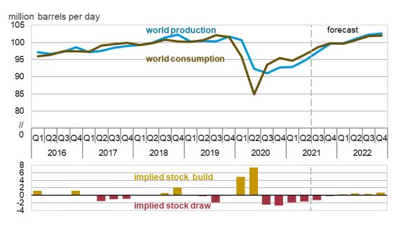 疫情导致原油需求恢复进度放缓。EIA预计2021年美国原油产量为1108万桶/日,较上年水平下滑20万桶/日,降幅有所扩大。EIA下调今年全球石油需求增幅预估37万桶/日,至496万桶/日。受到疫情影响,欧佩克将第四季度全球石油需求预估下调11万桶/日,至9970万桶/日。维持2021年全年石油需求增长预估基本不变,为596万桶/日。将2022年全球石油需求预测上调98万桶。将2021年非OPEC国家的产量预估下调20万桶/日,预计今明两年对欧佩克原油的需求将更为强劲。IEA预计10月需求将反弹160万桶/日,且增长势头将持续至年底。变异病毒传播导致8-9月份原油需求下调60万桶/日,将全年需求增长预估下调10.5万桶/日,同时将2022年的需求预估上调8.5万桶/日。