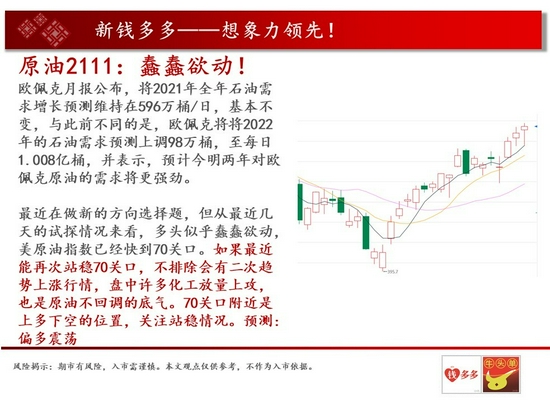基本面概述:欧佩克月报公布,将2021年全年石油需求增长预测维持在596万桶/日,基本不变,与此前不同的是,欧佩克将将2022年的石油需求预测上调98万桶,至每日1.008亿桶,并表示,预计今明两年对欧佩克原油的需求将更强劲。。