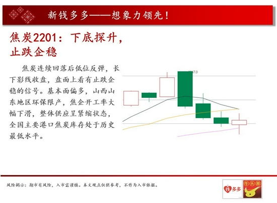 操作建议:焦炭连续回落后低位反弹,长下影线收盘,盘面上看有止跌企稳的信号。