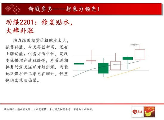 操作建议:动力煤因期货价格贴水太大,强势补涨,今天再创新高,还有上涨动能。