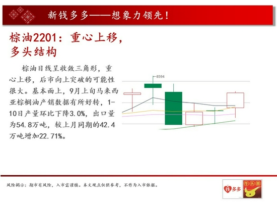 操作建议:棕油日线呈收敛三角形,重心上移,后市向上突破的可能性很大。