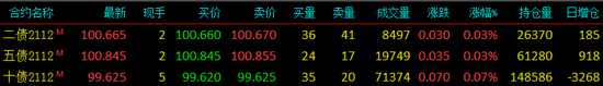 2021年9月16日,国债期货各品种主力合约全线上涨。截至下午收盘,十年期主力合约涨0.07%;五年期主力合约涨0.03%;二年期主力涨0.03%。