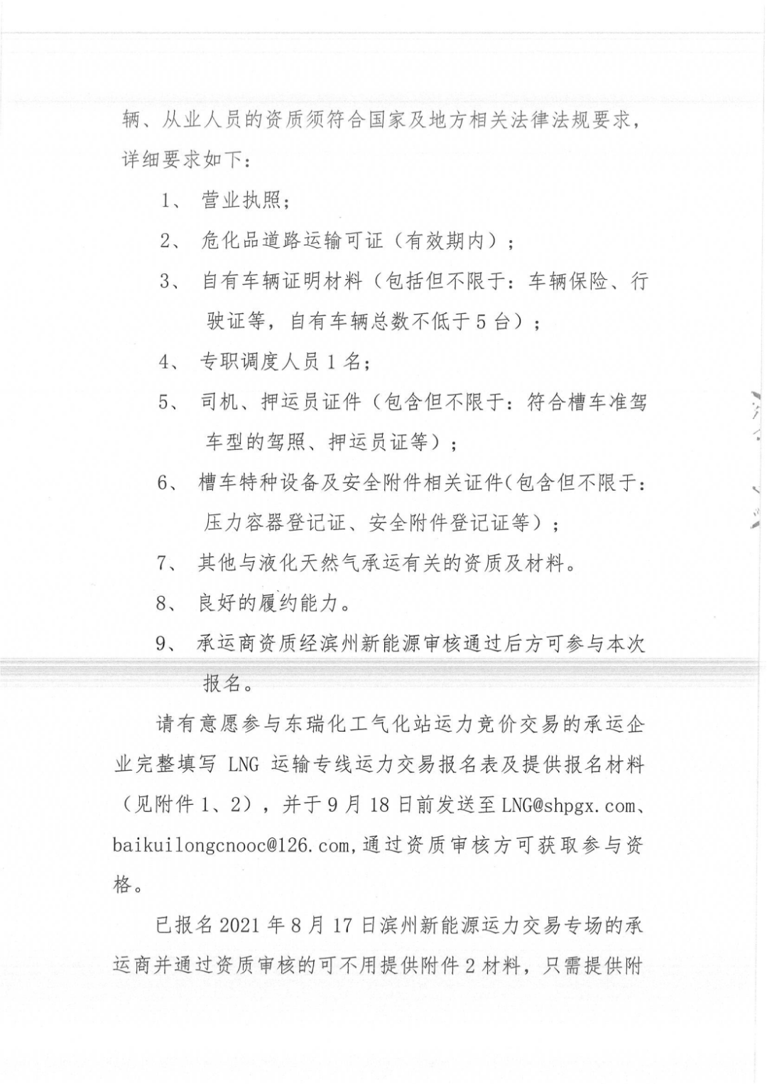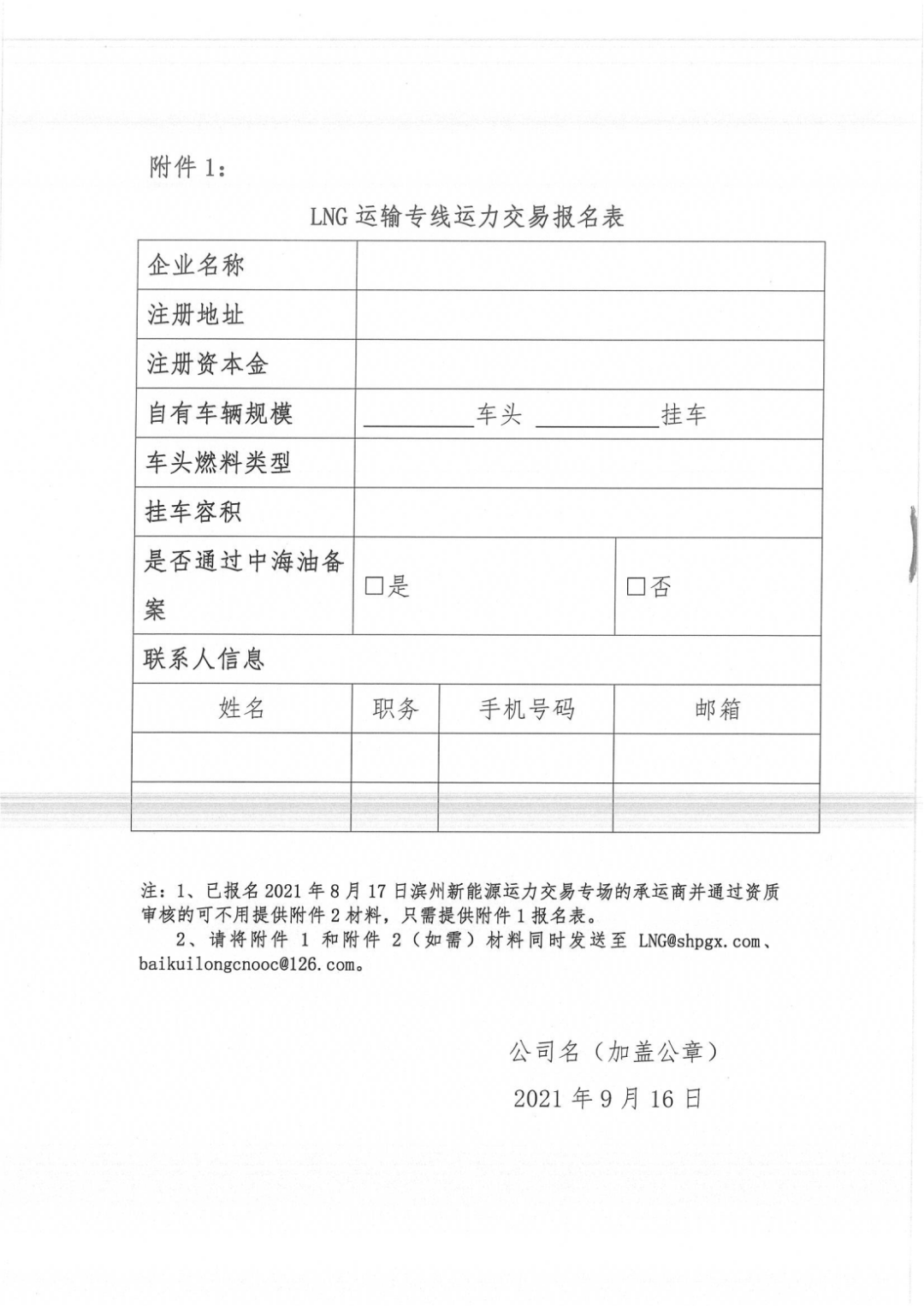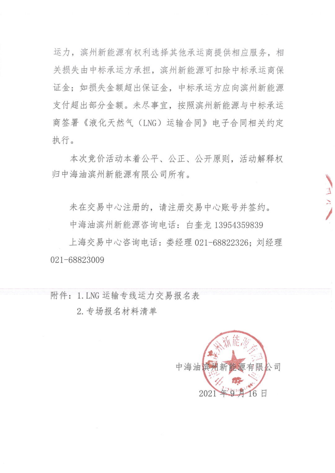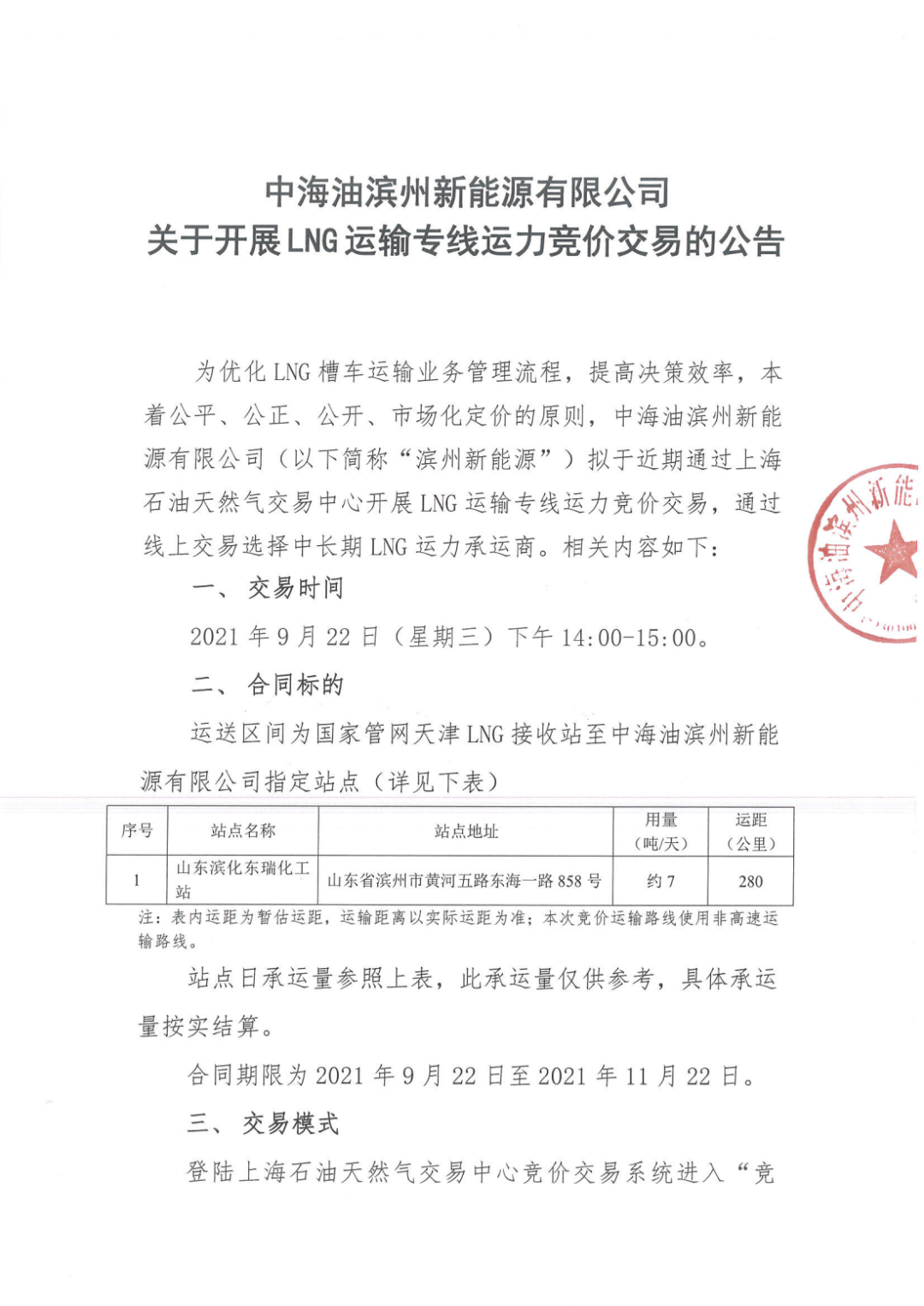 中海油滨州新能源有限公司拟通过上海石油天然气交易中心开展LNG运输专线运力竞价交易,现将滨州新能源公告转发,详见附件。