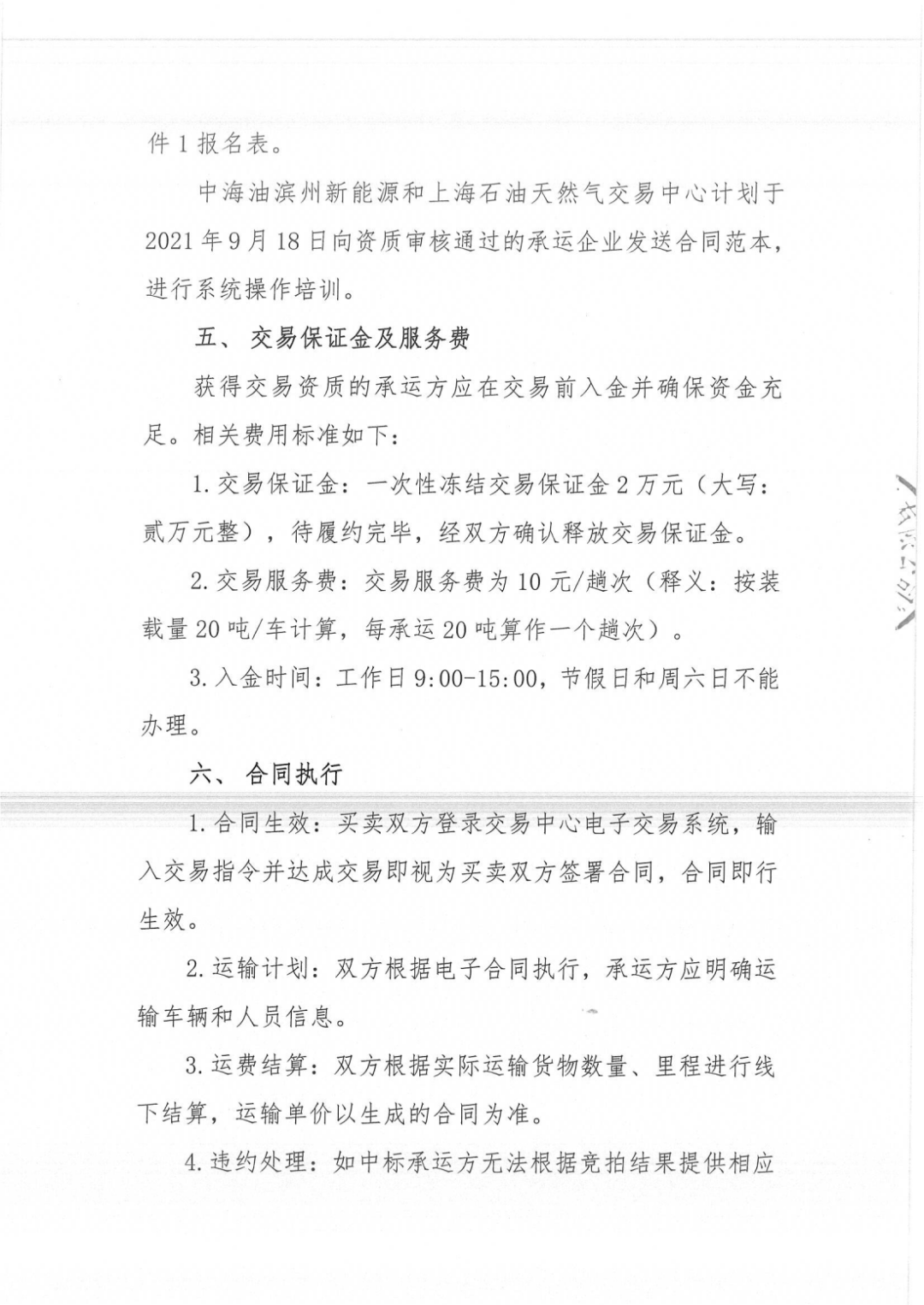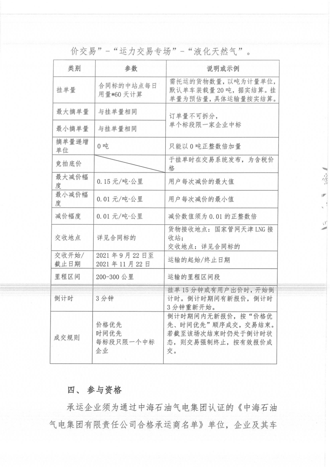 SHPGX导读:中海油滨州新能源有限公司拟通过上海石油天然气交易中心开展LNG运输专线运力竞价交易,交易时间为9月22日(星期三),详见附件。