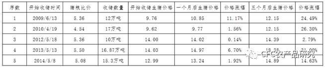 在过去10年我国曾开展过6次对生猪市场的托市收储,考虑到2019年的收储源自于非瘟影响恐慌抛售的影响不具备代表性,下文重点列举了2009年至2014年间的5次收储。