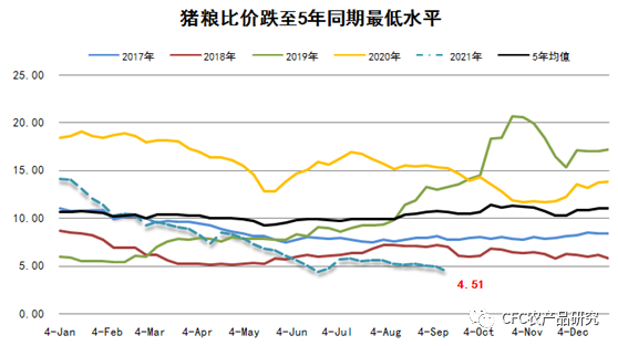 猪粮比是衡量我国生猪养殖行业利润的关键指标,一般认为猪粮比值跌破5.5,意味着行业面临普遍亏损,我们跟踪到目前的猪粮比价已经跌至4.51,这不仅5年同期的最低水平,也是行业近几年面临的最为明显的深度亏损之一。