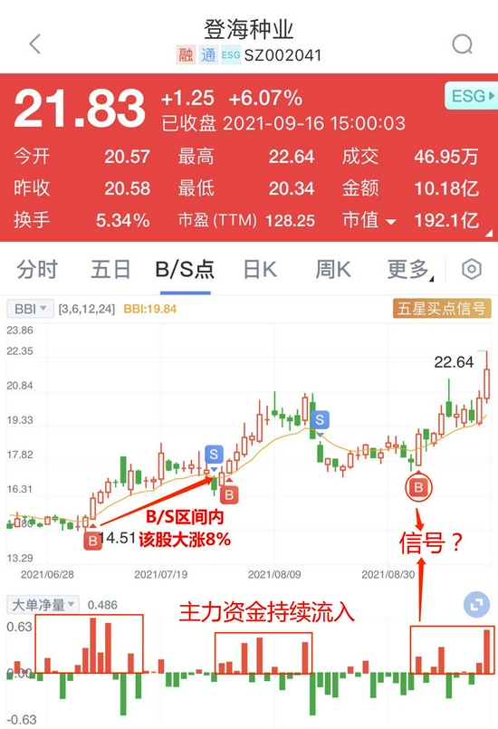 以今日大涨的股登海种业为例,通过新浪财经Level-2的大单净量发现,此前,在该股在拉升的同时,B/S点发出关键信号,并伴随着主力资金的天量流入!而近期,B/S点也再度发出机会信号,主力也再度大幅流入该股,该股自B/S点信号发出后的至今的10个交易日里大涨了22%。