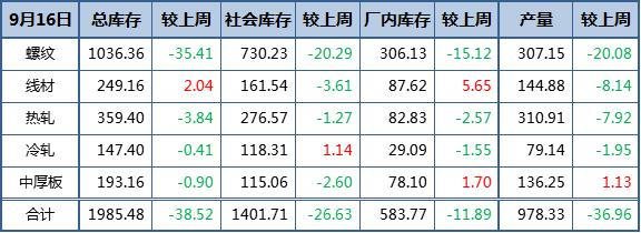 螺纹钢总库存下降35.41万吨至1036.36万吨,其中钢厂库存减少15.12万吨,社会库存下降20.29万吨至730.23万吨;线材钢厂库存续增,社会库存转降,总库存共增加2.04万吨至249.16万吨。热轧板卷总库存减少3.84万吨至359.4万吨,其中社会库存降1.27万吨,钢厂库存降2.57万吨,冷轧板卷以及中厚板总库存均小幅下降。