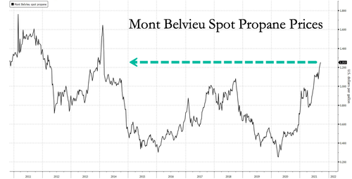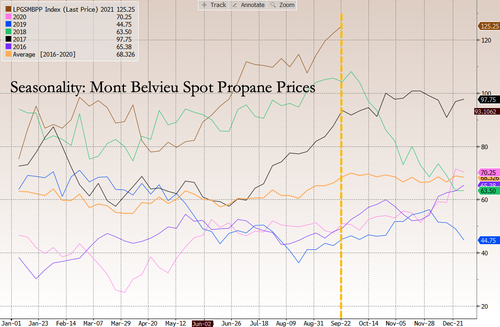 在美国,80%的丙烷产自于天然气加工,而眼下天然气价格已经持续飙升。