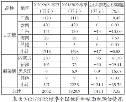 全国近5个榨季的糖料种植面积维持在2050万亩左右,由于竞争作物替代种植、城市化建设与“旱改水”项目侵占蔗地、机械化作业条件限制等原因,种植面积有逐年萎缩趋势。从我们实地调研以及跟各产区糖企交流情况综合分析,2021/2022榨季全国糖料种植面积将下降133万亩,同比下跌6.89%。