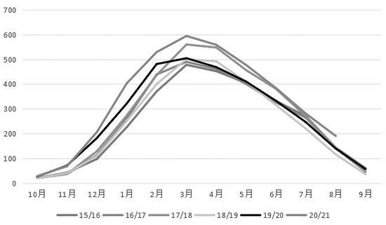 然而,今年现货市场供应充裕。2020/2021榨季截至8月末,全国累计销售食糖876.45万吨,同比减少25.69万吨;累计销糖率82.17%,同比减少4.45个百分点;工业库存190.21万吨,同比增加50.84万吨,以广西糖为主。物流紧张、运费上涨及加工糖报价更具优势,使得广西糖销往沿海销区困难重重,去库存速度缓慢。农业农村部将2020/2021榨季我国食糖进口量调增70万吨至560万吨,较上榨季大增183万吨。2020/2021榨季食糖工业结转库存将创近7年新高,我们预估为77万吨,较往年均值增加约40万吨。因此,新榨季国内食糖产量减少约50万吨,但是结转库存增加部分基本可以覆盖减产缺口。