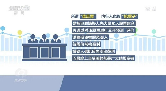 经过进一步的调查,稽查人员发现,这些神奇的股票其实就是“盘后票”,内行人也称“抢帽子”,是指犯罪嫌疑人先大量买入股票建仓,再通过对该股票进行公开预测、评价,诱骗投资者跟风买入,待股价被抬高时,嫌疑人借机反向卖出获利,而最终上当受骗的都是广大的投资者。