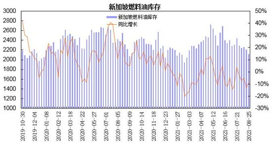 新加坡燃料油库存较7月呈现下降,处于五年均值水平,轻质馏分油库存小幅下降。