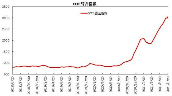 截至8月下旬,中国出口集装箱运价指数(CCFI指数)为3047.32点,较7月上涨117.29点,涨幅为4%,同比上涨244.2%。