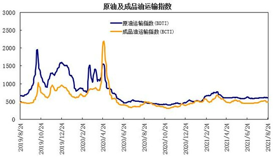截至8月24日,原油运输指数(BDTI)为605点,环比上涨0.2%,同比上涨26%;成品油运输指数(BCTI)为487点,环比下跌0.2%,同比上涨12.5%。