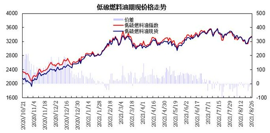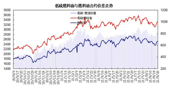 8月上中旬,德尔塔变异毒株导致新增确诊人数激增,疫情反弹拖累经济及需求预期,国际原油期价震荡回落,新加坡燃料油现货价格下跌,低硫与高硫燃油价差逐步回落,燃料油主力合约自2600元/吨逐步回落至2300元/吨区域;低硫燃料油主力合约从3500元/吨关口逐步下滑至3100元/吨区域。下旬,疫情忧虑情绪有所缓和,墨西哥海上石油钻井平台火灾导致生产中断,OPEC+可能暂停增产支撑油市,国际原油市场连续反弹,燃料油期货市场呈现探低回升走势;燃料油主力合约回升至2500元/吨区域,低硫燃料油主力合约连续反弹至3300元/吨区域。