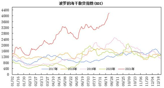 波罗的海贸易海运交易所公布的数据显示,截至8月24日,波罗的海干散货运费指数(BDI)为4201点,较7月上涨909点,环比涨幅为27.6%,同比涨幅为181.8%。其中好望角型运费指数(BCI)为6206点,环比涨幅为44.1%,同比涨幅为181.2%;巴拿马型运费指数(BPI)为3846点,环比涨幅为16.4%,同比涨幅为135.7%;超级大灵便型运费指数(BSI)为3343点,环比涨幅为13.5%,同比涨幅为246.4%;小灵便型运费指数(BHSI)为1888点,环比涨幅为7.3%,同比涨幅为240.8%。
