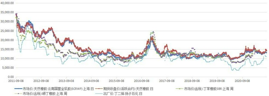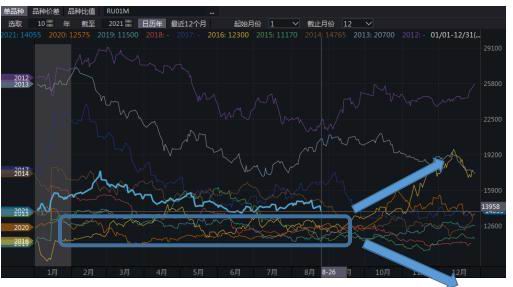 目前橡胶的价格水位,若横向对比,在众多商品中是属于低位的;但若自身纵向对比,沪胶现在仍然高于过去5年的低位核心区间,季节性节奏与往年基本一致。在基本面没有突破的情况下,沪胶正重回过去几年的低位核心区间。