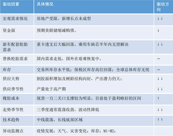供应方面,大周期基调仍然是过剩,单产潜力大;目前已经进入高产期,天气正常,供应积极性暂没有问题,气候预期良好。旺产季变数看天气和疫情,关注原料价格。中美贸易战以后东南亚工业化进程加快,提振了当地人工成本,依然支撑橡胶成本,但阶段性的疫情爆发影响工业用工需求,分散的橡胶割胶则未受影响。库存方面,上期所库存持续低位,青岛库存去库至低位,海外需求相对偏强,价格外强内弱,国内到港减少。需求端,配套方面,国内7月份重卡销量同环比大跌,而缺芯和消费力下降又影响了乘用车配套需求。替换方面,房地产持续受压,社会经济活动也受到疫情走高影响。出口方面受海运费高昂打击。轮胎厂开工率仍处于近年区间低位,工厂成品库存高原料库存低。橡胶供应问题不大,需求缺乏驱动,而成本支撑尚可。