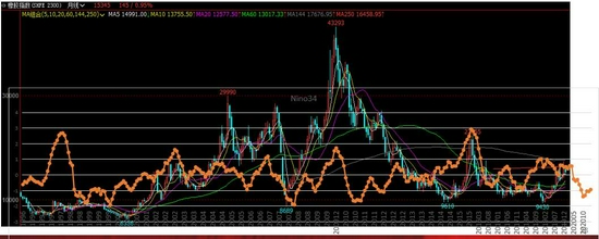 下图为厄尔尼诺指数前移13个月后与沪胶指数月线图叠加的图形,可见厄尔尼诺指数与沪胶指数高低点的重合度比较高,领先沪胶指数一年左右。