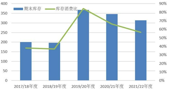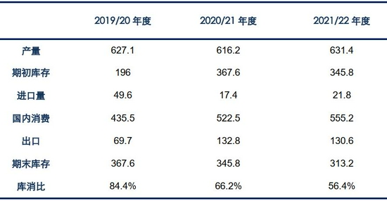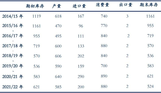 表4:中国棉花供需预测(2021年8月)单位:万吨