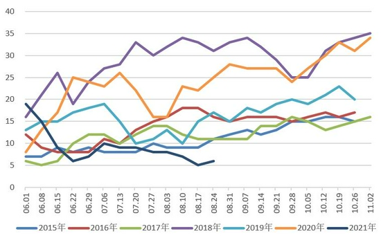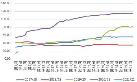 美国:8月份市场根据美棉较好的优良率都预计USDA将上调美棉产量,但是USDA却是出乎意料的下调了美棉的产量。USDA报告将美国2021/22年度棉花弃种率上调至12%,单产下调至800磅/英亩,产量下调11.7万吨至375.9万吨。新年度美棉苗情较好,优良率高于往年同期,差苗率低于往年同期,未来产量调增的概率较大。销售端,由于中国签约美棉量较少且东南亚近期由于疫情签约量也略有下降,美棉整体的签约销售情况都比较差。之前美棉的大幅上涨很大一部分基本棉原因是由于美棉的期末库存量大幅下降,但是从新年度美棉的产量以及销售情况来看,每年的基本棉并部乐观。