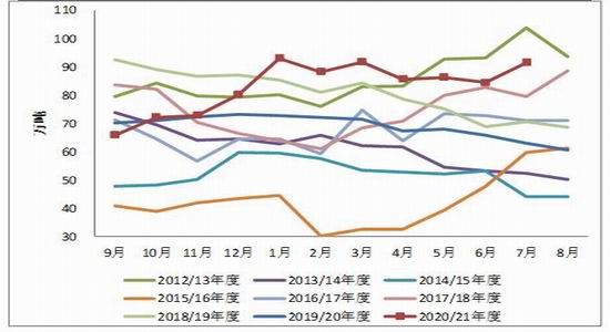 印度棉花协会发布7月月报,本年度产量以及期末库存预期环比双双减少。从分项数据来看,本年度产量预期小幅减至602.7万吨;国内棉花需求上调至561万吨,较6月基本持平;出口量预期130.9万吨,较6月调增8.5万吨,增幅6.9%;期末库存减至140.3万吨,环比减少12.2%。据悉截至8月9日印度CCI棉花仍有14.8万吨,其中2020/21年底棉花13.3万吨。