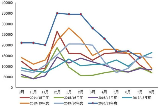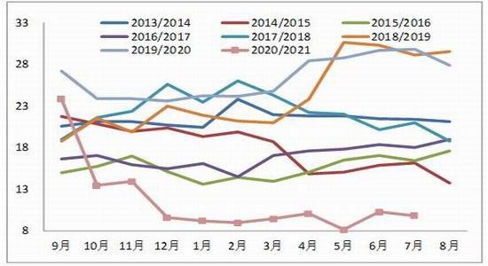 概述:8月份国内棉花供应仍充足,250多万吨的商业库存+大量进口棉+储备棉,按照储备棉成交40万吨,棉花进口量30万吨(每月15万吨)计算,预计在10月份新花大量上市前的2个月里面有三百多万吨的棉花供应量,棉花供应相对充足。消费端,7月国内消费数据大幅下调,与之前的预期差距较大,8月份仍是纺织行业传统淡季,但是从8月下旬开始行业将逐渐进入旺季,未来9、10月份都是棉花消费的旺季,市场更是在为“双11”的订单做准备,预计未来国内消费环比将逐步好转,但是同比或者说和2019年相比内销数据就存在较大的不确定性。外销数据仍然不错,外需数据不错一方面是由于东南亚其他国家疫情导致的部分地区封锁,订单外流,另一方面是由于美国、欧洲等地的消费复苏带来的,未来圣诞节备货等等也会给外需持续的动力。