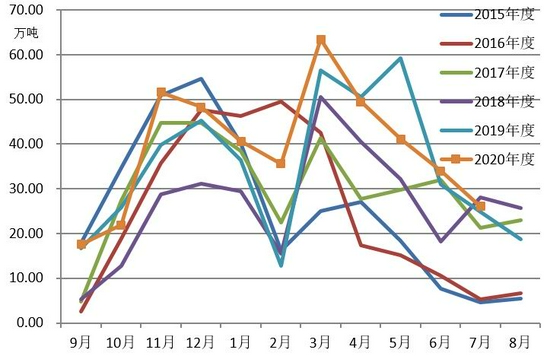 国内市场的基本情况是供需两旺,8月份棉花除了有大量的商业库存,储备棉和进口棉才开始大量流入国内市场,从供应端来看在新花上市前市场上供应仍然比较充足,可能会存在结构性的短缺,但是从整体量上来看仍比较充足。但是我们也需要看到国储库存大量下降,和高峰期比现在是非常非常低的。此外7月份的商业库存数据虽然绝对值较高,但量要比前两年都低。因此供应端虽然宽松,但长周期以及近两年同期来看棉花仍是一个去库存的周期。需求端,本来9、10月份是应该是纺织品服装的消费旺季,但是今年的情况预计会和往年也有所不同。首先是内需方面,从7月份的内需数据来看,消费情况可能并不如预期那么好,但双“11”的节假日消费预计仍将提升国内的消费情况。其次从外需上来看,今年由于疫情影响,欧美的圣诞节补库节奏整体提前,美国的许多订单都在9月之前就结束了,但是东南亚的疫情一定会有大量的外单流到中国市场。所以综合考虑,外需方面可能并不如预期那么好,但有其他国家的订单做补充,预计整体情况仍不错。