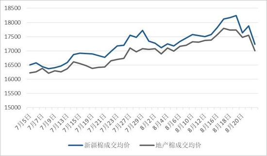 8月上中旬由于抢收预期以及下游的消费情况较好等因素驱动国内棉花价格继续大涨,郑棉2201合约价格从17500元/吨附近最高上涨18500元/吨,但是8月下旬一方面由于宏观层面公布的国内7月份数据普遍转差,且美联储货币收紧预期也越来越强,大宗商品整体下跌,原油更是技术性转势,棉花跟随下跌,另一方面由于当前棉花绝对价格较高,政府层面也出台了关于储备棉的新规,市场解读政府对棉花价格的容忍度下降,未来可能会出台更多的措施来调节市场价格。因此8月份的棉花价格出现了先涨后跌的趋势。同样美棉也先涨后跌,价格从8月初的90美分附近最高涨至96.7美分/磅,之后也出现了较大幅度的下调,但是美棉走势从技术图形看上涨趋势仍未结束。