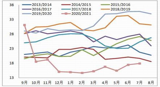 市场需求较好,棉纱贸易商积极采购棉纱,使得纺织企业积极备原料库存,而纱布库存仍处于低位,目前纺织企业的利润虽然较之前有下降,但是仍处于相对高位。根据中国棉花信息网数据,截至7月底纺织企业在库棉花工业库存量为91.45吨,较6月底增加6.99万吨,同比增加了28.5万吨。根据中国棉花信息网数据,截至7月底,纺织企业纱线库存天数为9.82天,较6月减少0.45天,同期坯布库存天数为17.89天,较6月增加0.44天。利润方面,8月虽然棉花原料价格上涨,但是棉纱反映相对迟钝,涨幅明显不及原料价格上涨,但是随着8月下旬原料价格的下跌,纺纱利润略有恢复,目前C32S的利润每吨仍在一千多元。