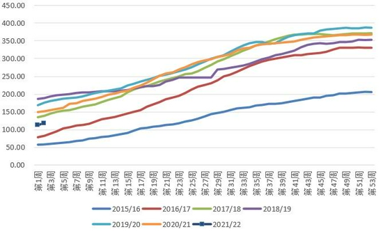 根据USDA最新报告,截至8月12日一周美国2021/22年度陆地棉累计签约量为118.36万吨,签约进度为37%,5年均值为46%,截至当周累计装运量为9.34万吨,装运进度为3%,5年均值为3%。新年度美棉签约量为118.36万吨,大幅低于往年同期的签约量,分析其主要原因是中国签约差,前几年同期中国已经签约了美棉四五十万吨,但是今年中国签约新年度棉花的量还不到二十万吨,因此中国签约量大小将对未来美棉的基本面影响很大。