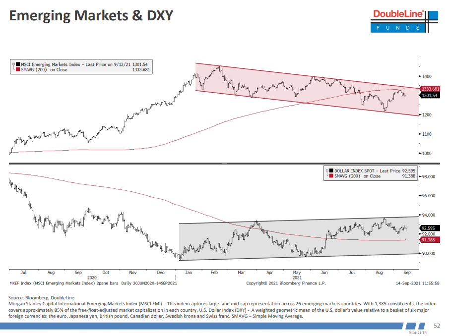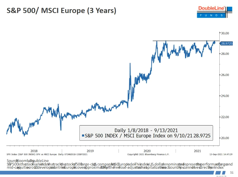 年初Gundlach买入欧股以来,相对标普基本上只是打平,但他还是比较喜欢欧股,觉得美股最近几年outperform欧股太多, 但最近一年只是在高位徘徊,他觉得当一个上升趋势不再继续而是在高位徘徊,那么变盘的机会就比较大。我自己从基本面角度看,一来欧洲疫苗接种后来居上,二来如果德国选举是民调领先的舒尔兹上台,则有望和马克龙/马里奥组成欧洲财政刺激三角来推动更激进的财政政策刺激经济/股市。欧股跑赢美股值得期待。