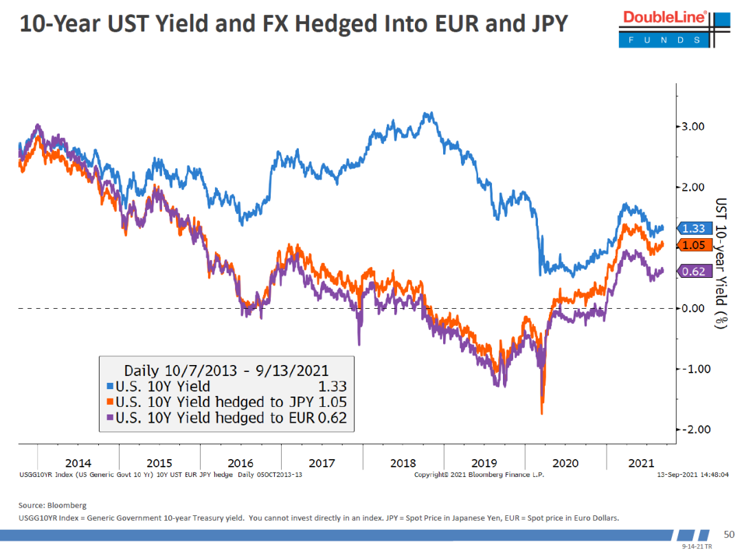 回头看,他认为今年3月份时候美债利率回落是因为海外投资者看到了对冲汇率风险后的美债收益率很高从而买入美债。紫线(欧元对冲)和橙线(日元对冲)在3/4月份都到了5年内最高位置,而且对比欧日的本土国债也非常吸引。