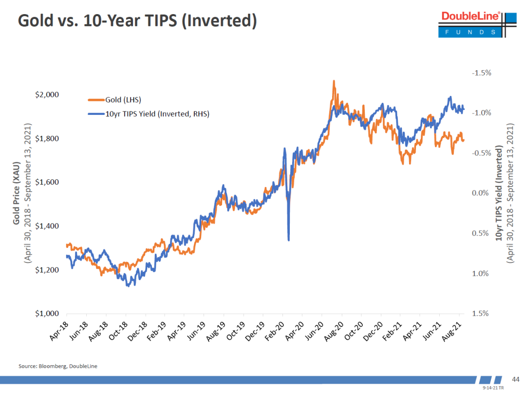 他在黄金1800美金的时候转为中性,目前黄金仍然在1800附近徘徊。黄金一直以来和10年期TIPS走势很贴近,近期两者的背离显示黄金短期内有上涨空间。另外,由于中长期看空美元是他们基金各个宏观分析师最坚定的call,所以他觉得黄金中长期还有很大的上涨空间。