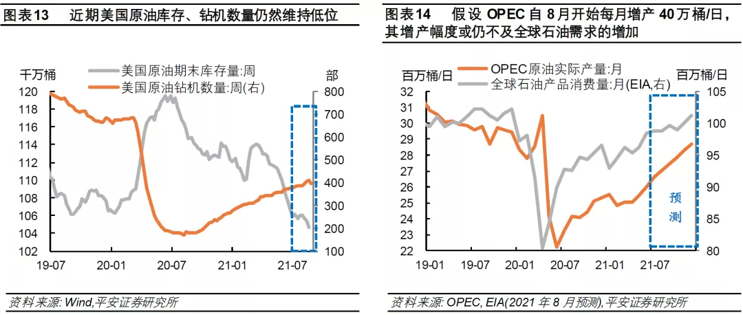 我们认为,下半年限制美国石油企业和OPEC+集团大幅增产的关键因素(修复企业负债或国家财政赤字、经济转型需求等)不变。截至目前,全球原油市场“供给约束”情况基本符合我们的预期。美国方面,美国原油库存仍然维持低位,美国原油钻机数量仍然弱于历史表现(图表13);OPEC+方面,7月18日OPEC+同意自8月开始逐月增产40万桶/日,9月1日OPEC+宣布维持增产计划不变,但这一幅度仍然是克制的。今年7月OPEC产量仅2666万桶/日,比2019年平均水平相比仍有320万桶/日的差距(少11%),而EIA统计的7月全球石油消费量与2019年均值的差距仅为210万桶/日(仅少2%)。假设OPEC自8月开始每月增产40万桶/日,其增产幅度或仍不及全球石油需求的增加(图表14)。