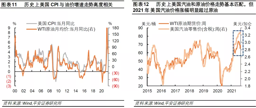 首先,油价增速与美国通胀指标走势高度相关。从美国CPI的结构出发,据BLS在7月公布的数据,能源分项(包括能源品和能源服务)占美国CPI的比重为7.2%,交通运输服务分项占比5.3%。我们测算,在7月美国CPI同比增速的5.4%中,二者合计拉动就有了2个百分点。历史数据显示,美国CPI与油价月度同比增速走势高度相关(图表11),因为除能源品外的其他商品和服务价格通常是相对稳定的。