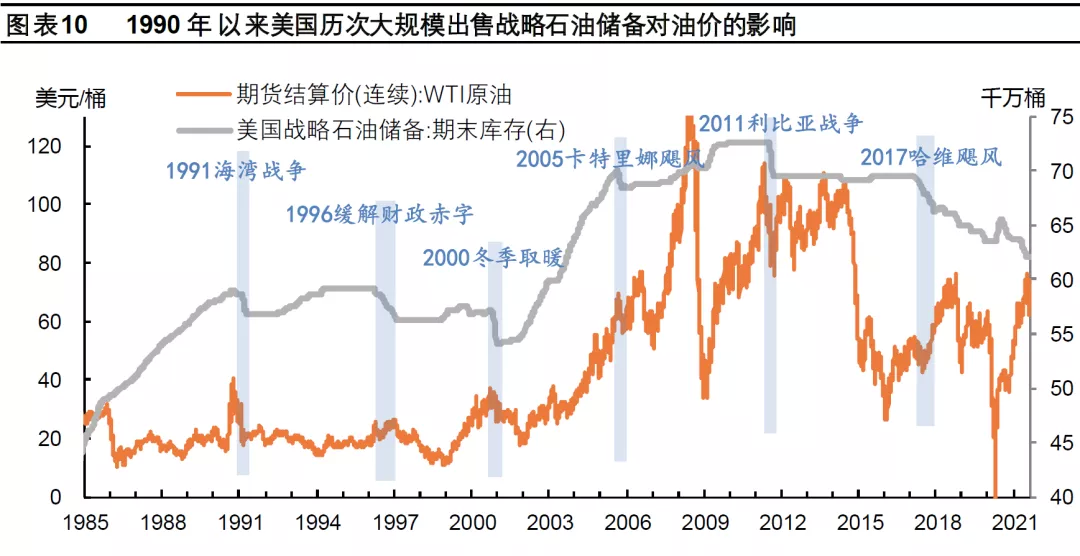 我们梳理了1990年以来美国历次大规模出售战略石油储备对油价的影响(图表10)。1990年以来美国政府进行过6次规模在1500-3000万桶的战略石油储备出售,触发因素包括战争、飓风等紧急事件,以及缓解财政赤字、缓解季节性用油紧张、或讨好选民等。