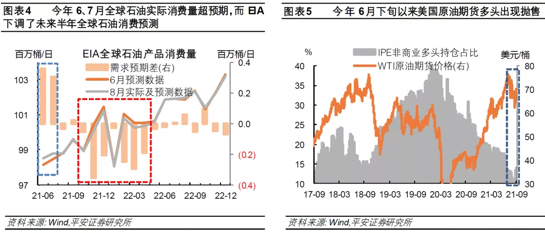剑客一:Delta变异病毒。今年7月以后,全球新冠疫情因Delta变异病毒而进一步恶化,美国和中国作为全球前两大石油消费国均受影响。本轮疫情暂时仍未对全球石油消费造成明显冲击,但显著打击了需求预期。国际能源署(IEA)8月报告中,将2021年下半年原油需求预估下调55万桶/日。考虑到,今年6-7月全球石油消费维持强劲、全球航班数据显示8月需求不弱、主要经济体本轮防疫政策力度有限等,新一轮疫情对全球经济活动及石油需求的边际影响或有限。今年7-8月WTI原油期货非商业多头占比下滑至疫情以来新低。目前市场可能已经充分(甚至过度)price in本轮疫情对于下半年石油需求的冲击。
