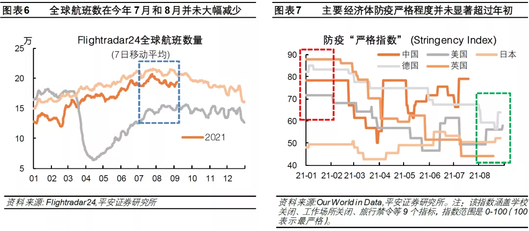 我们判断,新一轮新冠疫情对全球经济活动及石油需求的边际影响可能有限。第一,今年6、7月全球石油消费在疫情扰动下维持强劲,本轮疫情对石油需求的冲击尚未显现。对比EIA在6月和8月更新的数据,今年6、7月全球石油实际消费量反而超预期增加,分别超过6月预测值36万桶/日和30万/桶日。第二,高频数据显示8月全球交通需求不弱。例如,Flightradar24统计的全球航班数在7月和8月期间并未大幅减少,且当前水平已经接近2019年疫情前的水平(图表6)。第三,主要经济体本轮防疫政策力度有限,继而对经济活动和石油需求的影响有限。中国、日本等亚洲经济体短期升级了防疫管控,但力度仍较有限;英国、德国和美国等欧美经济体在疫苗保护下趋于“躺平”。据牛津大学Our World in Data网站测算,新一轮疫情爆发后,主要经济体政府防控疫情的“严格指数”(Stringency Index)并未显著超过今年年初水平(图表7)。