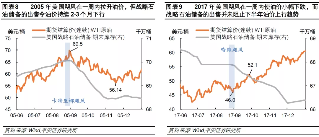 历史上,飓风对油价的影响并不确定,因飓风可能同时影响石油供需,且美国政府还可能通过出售战略石油储备以平抑油价。2005年“卡特里娜”飓风(五级)和2017年哈维飓风(四级)是美国历史上对经济影响最大的两次飓风。2005年美国飓风在一周内拉升油价,因飓风主要破坏了石油生产和供给;但美国政府随后出售战略石油储备,令油价持续2-3个月下行(图表8)。2017年美国飓风在一周内使油价小幅下跌,原因是飓风主要影响炼油厂生产,意味着炼油厂对原油的需求减弱;而随后战略石油储备的出售并未阻止下半年油价上行趋势(图表9)。