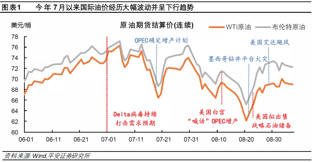 我们在2021年6月判断,2021年下半年国际油价主要维持在70-80美元/桶区间,同时不排除油价短时间升破80美元/桶的可能(参考2021年6月30日报告《油价会不会是下一个“灰犀牛”?》)。但Delta变异病毒对中美等石油需求大国的冲击、美国飓风对供给的扰动、以及美国政府通过抛储等手段企图抑制油价,这些均超出我们此前的预期。上述“三剑客”将对今年9月以后的油价产生复杂影响,本文重点讨论其影响并再次展望今年下半年油价走势。