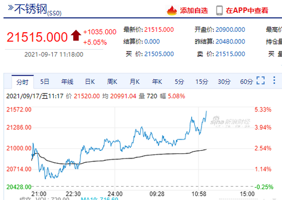 9月17日,不锈钢(SS)主力合约涨幅扩大至5%,现报21515元/吨,续创合约上市新高。
