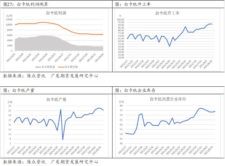 8月国内港口库存高位震荡为主,其回调上涨主要原因是修正7月台风导致的货运减少局面,但8月德尔塔病毒再次席卷全球,导致航运受阻,到港货船减少,港口库存下降。不过由于下游需求不旺,纸浆放量有限,纸浆库存高位整理为主。我们认为,在当前疫情影响下,纸浆供给偏紧张,且在旺季预期下, 9月国内港口库存或存在走弱可能。