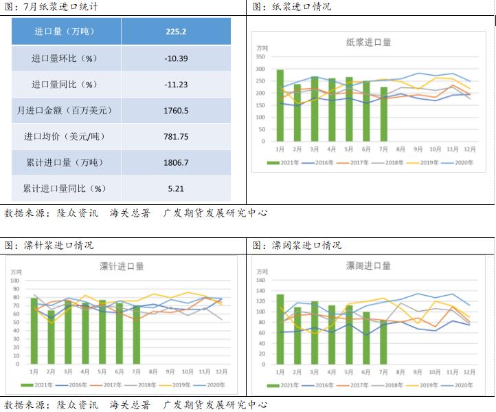 据海关数据显示,2021年7月纸浆进口量为225.2万吨,环比减少10.39%,同比减少11.23%。中国2021年1-7月纸浆累计进口量为1806.7万吨,较上年同期增加5.21%。分浆种来看: