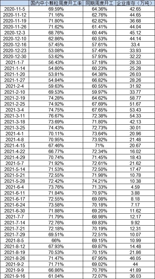 本周少数尿素企业因能耗双控出现临时停车,开工率环比下降明显,更是比去年同期低10%,且传言山西工厂将面临环保影响。本来中下旬开始,尿素前期检修及故障装置将逐渐恢复。企业库存连续三周下滑。