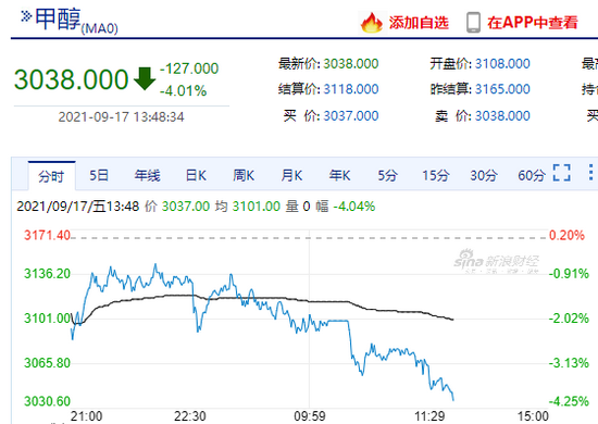 9月17日午后开盘,甲醇主力合约大跌4.01%,现报3038元/吨。