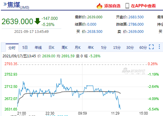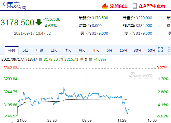 快讯:9月17日下午,焦煤、焦炭主力合约均最低跌超5%,当前焦煤主力报价2638元/吨,跌幅5.28%,焦炭主力报价3178.5元/吨,跌幅4.66%。
