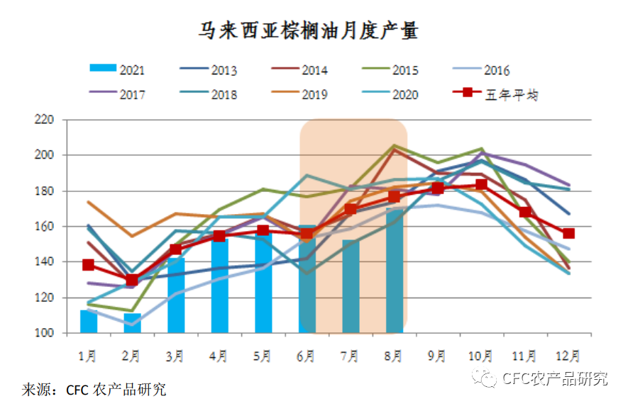 受此影响,虽然马来西亚早已经恢复了正常的降雨量,但棕榈油产量迟迟没有得到有效提高。2021年1-8月马来西亚棕榈油产量1159万吨,较去年同期减产9%。